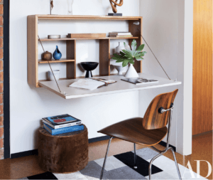Vous avez peut-être besoin d’un bureau et d’une table à manger, mais en avez-vous vraiment besoin 24h / 24 et 7j / 7? Pensez à installer des meubles qui peuvent se replier lorsqu’ils ne sont pas utilisés. Vous libèrerez de l’espace au sol et éviterez les piles de courrier et de travail qui s’accumulent inévitablement sur ces surfaces. Si vous avez une cuisine à un seul mur, les portes pliantes peuvent masquer l’encombrement lorsqu’elles ne sont pas utilisées.