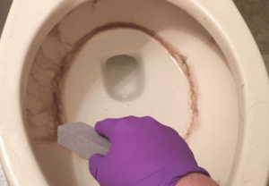 Il n’est pas nécessaire de vidanger la cuvette des toilettes pour effectuer ce processus. Assurez-vous simplement de couper l’alimentation en eau des toilettes. Utilisez des gants en caoutchouc et frottez la zone affectée avec le calcium accumulé avec une pierre ponce humide.