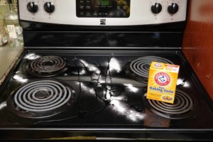 La première chose à faire est de tout retirer du poêle; cela inclut également les brûleurs s’ils peuvent être retirés. Je fais cela parce que la nourriture peut être piégée en dessous et s’accumuler avec le temps et peut être impossible à enlever lorsqu’elle est cuite. Mon poêle est électrique et les brûleurs peuvent être retirés, donc si vous avez une cuisinière en verre, ce sera encore plus facile à nettoyer car vous n’avez pas à retirer les brûleurs.