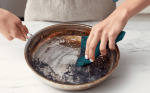 Massez la pâte dans les particules de nourriture brûlées ou séchées. Le savon de Castille travaille pour nettoyer la casserole, l’huile d’orange et le bicarbonate de soude aident à soulever tout ce qui est collé à la poêle sans le rayer. Pour les endroits vraiment difficiles, ajoutez un peu de pâte et un peu d’eau tiède, puis frottez avec une éponge.